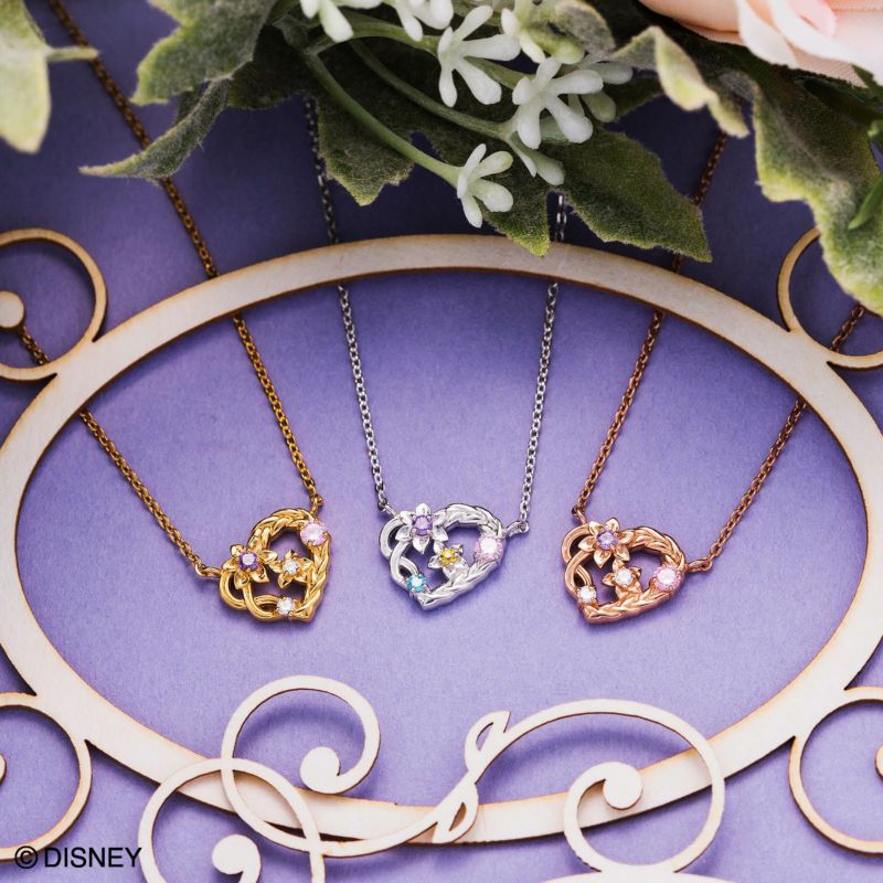 ラプンツェルの長い髪の編み込みをイメージしたエレガントなオープンハートにお花のモチーフをセットしました。