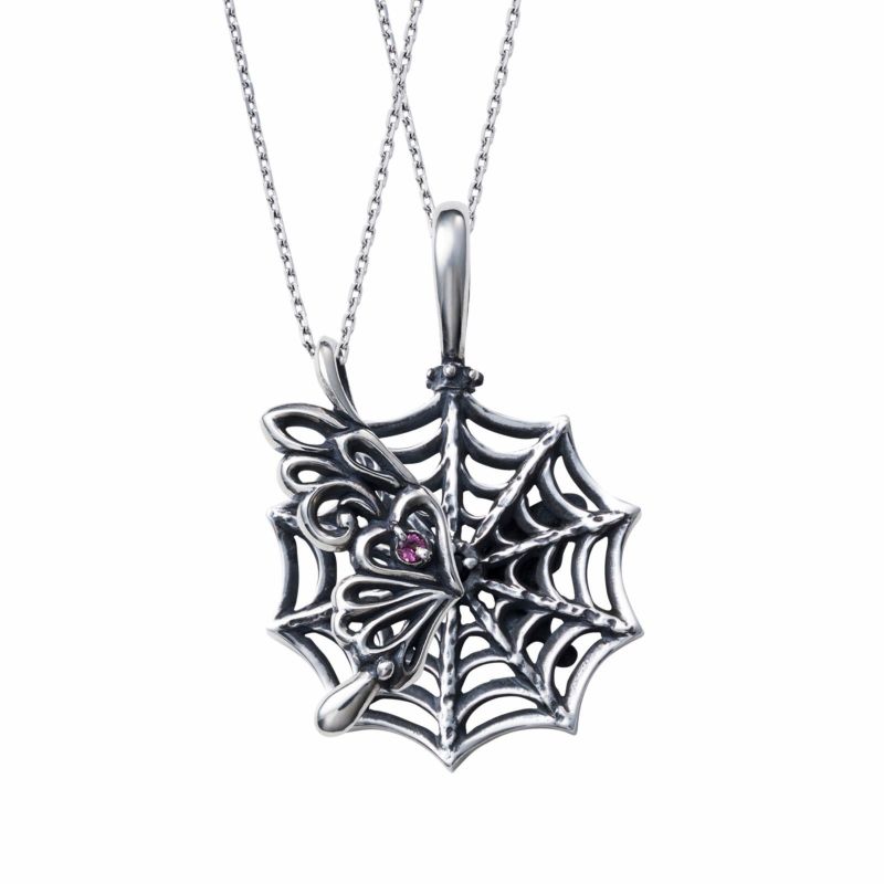 蜘蛛の巣をモチーフにしたメンズペンダントの裏側には、小さなアゲハ蝶がデザインされています。