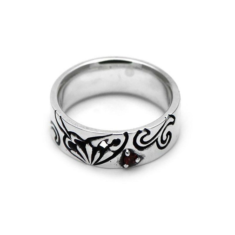 平打ち型のリングにやわらかい唐草模様と蝶の片方の羽が彫り込まれたシルバーリング。