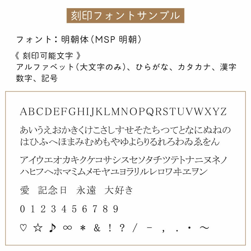 リングサイズや刻印字体などによっては15文字刻印できない場合もございますので、ご注文完了後に弊社からお送りするメールを必ずご確認ください。