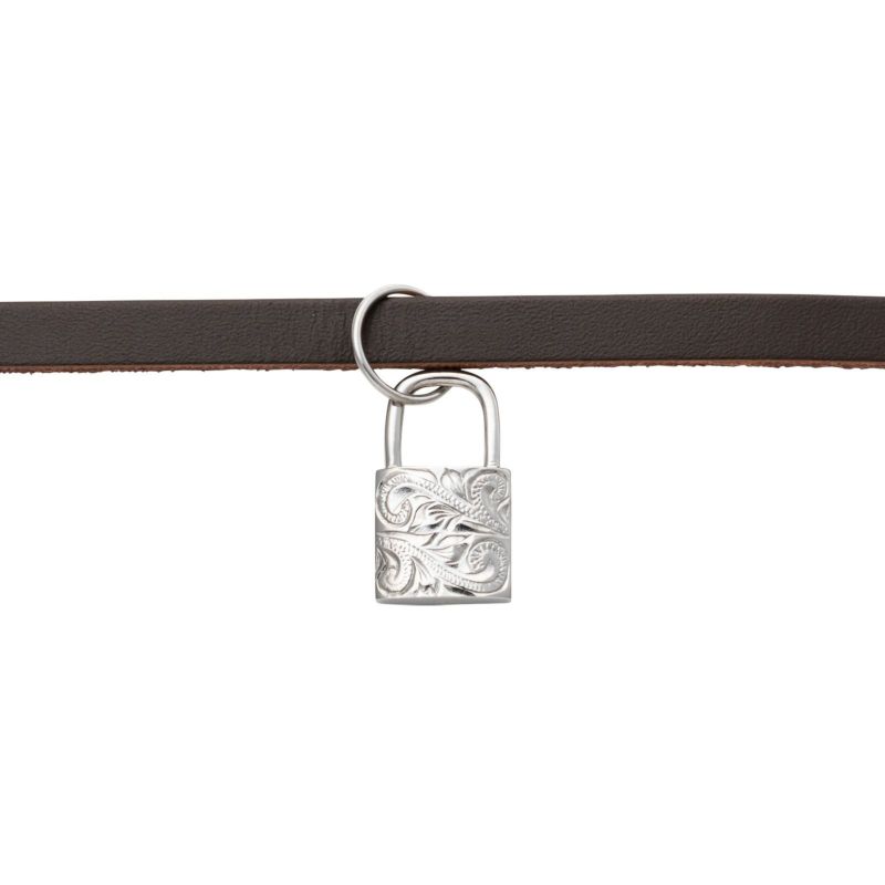 南京錠モチーフのトップ表面にハワイアンジュエリーの伝統的なモチーフのマイレ(葉)とスクロール(波)の繊細な彫りを施したペアレザーブレスレットです。