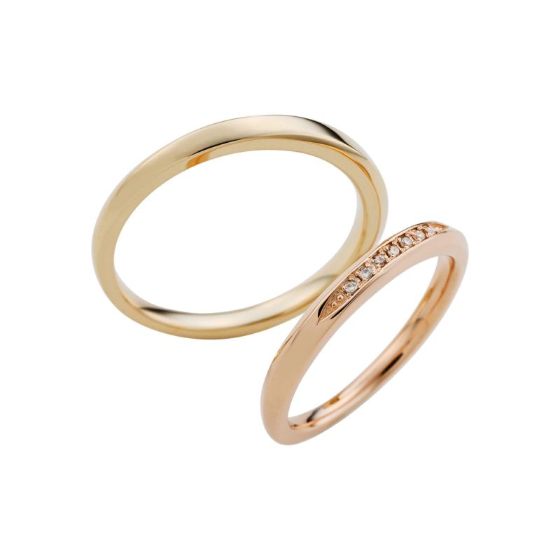 素材はレディースリングが10金ピンクゴールド(K10PG)、メンズリングが10金イエローゴールド(K10YG)です。