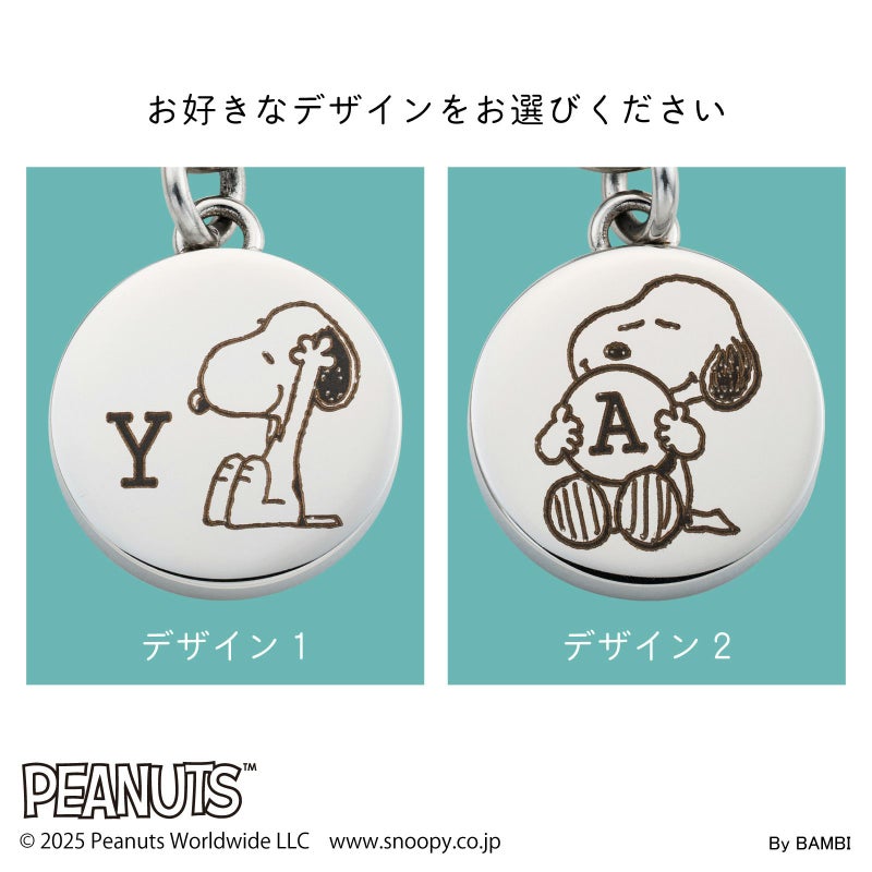 プレート表面には2種類から選べるスヌーピー、裏面にはかわいい足跡がデザインされています。表面にはイニシャルをひとつ刻印できます。