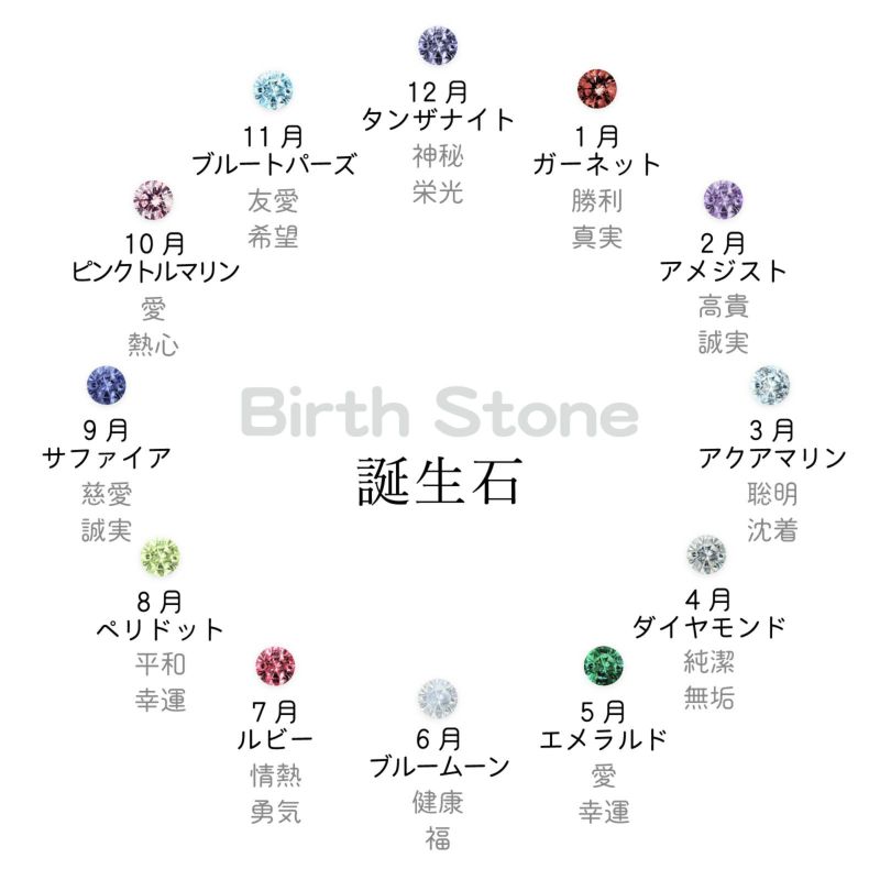 誕生石セッティング 1月ガーネット、2月アメジスト、3月アクアマリン、4月ダイヤモンド、5月エメラルド、6月ブルームーン、7月ルビー、8月ペリドット、9月サファイア、10月ピンクトルマリン、11月ブルートパーズ、12月タンザナイト