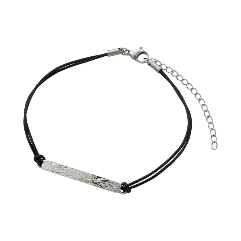 「幸福」を意味するスクロール(波)、「平和」や「縁結び」の象徴マイレ(葉)、「大切な人の幸せを願う」プルメリアなど、ハワイアンジュエリーの伝統的な模様がデザインされたコードタイプのメンズブレスレットです。