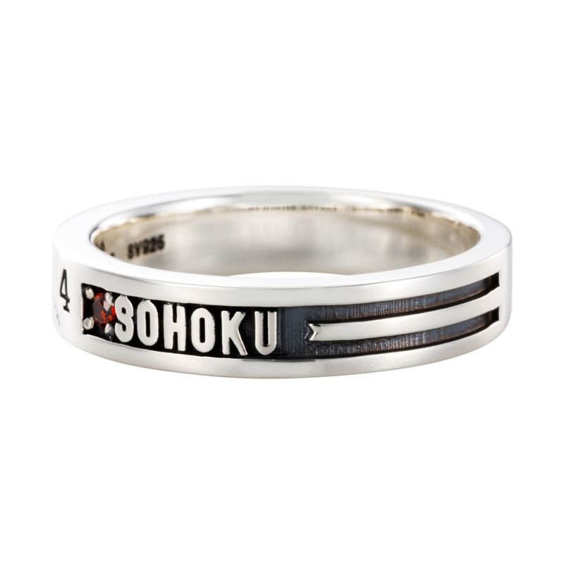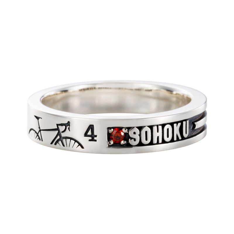 リングの外側には自転車のシルエットと「SOHOKU」の文字、背番号「4」が刻印されており、青八木 一をイメージしたカラーストーンをセットしました。